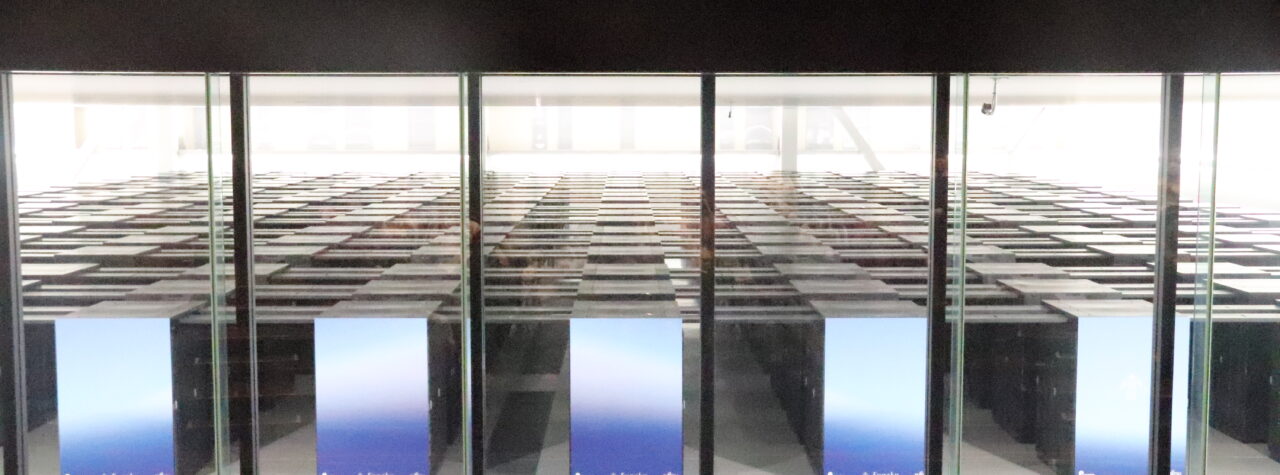6階の見学ホールは、計算機室の中に432台の富岳が並ぶところをガラス越しに見ることができる。