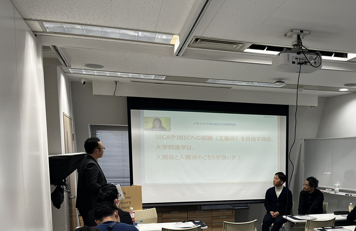 イベントでは、神戸情報大学院大学で客員教授を務め、現役の開発コンサルタントとして活躍する竹内知成氏をはじめ同大学院の修了生2名と、合同会社サスコン・代表の田中信行(筆者)が登壇し、それぞれの大学院進学の経験談や国際協力のキャリアパスにおける大学院進学の意義について話をした。