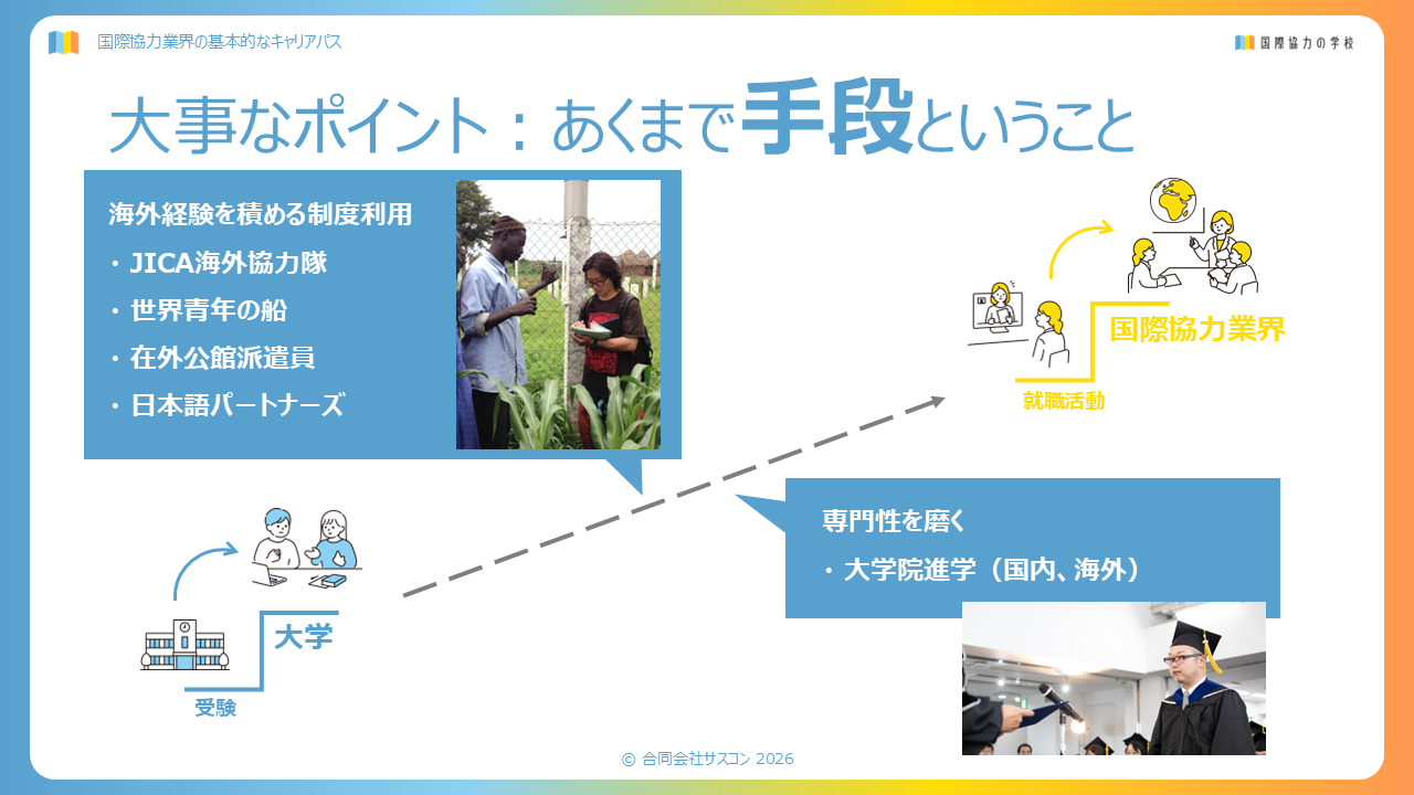 あくまでも“(長期的な)海外経験”も“修士号取得”も手段にすぎない。あくまで目的は国際協力に資する仕事に就いて、何かしらの社会課題解決をすることである(≒社会課題解決することによって実現したい社会)