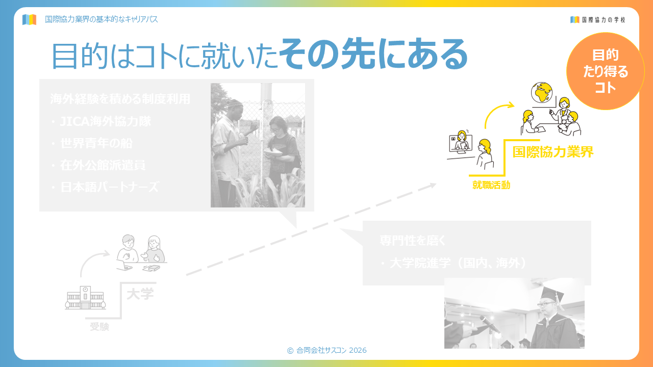 そもそも国際協力業界のキャリアパスは、新卒ルートが少ない。学生を終え一度、社会に出てからも国際協力に資する職に就くまでは、自らでキャリアプランを考え、行動し、決めないといけない。