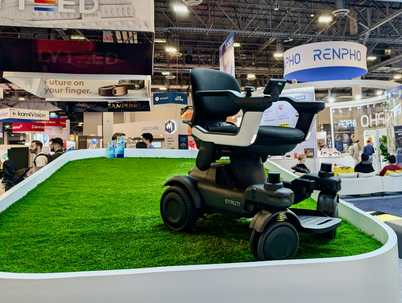 シンガポールに本社を置くSTRUTTが開発するマイクロモビリティ「Strutt EV1」は走行性に優れ、最大で13度の坂や5cmの段差も安定走行できる。さらに自動運転と同様の機能を持つカメラやLiDAR、各種センサーをコンパクトなボディに搭載しており、障害物や危険を避けながら安全に移動できる。目的地の入力は「キッチンまで移動して」というように自然言語で簡単に入力でき、実際に試乗してみたが、室内で人がたくさんいる場所でもゆっくりだが問題なく目的地へ移動できた。