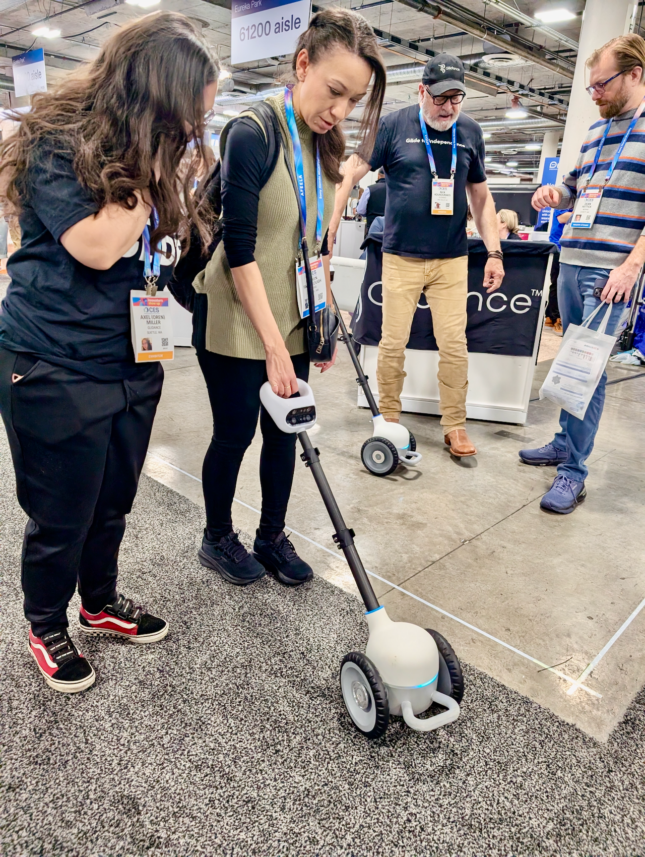 MSリサーチで製品開発責任者を務め、視覚障害者であるエイモス・ミラー氏が起業して開発した「Glide」は、自動運転機能を備えた白杖になるロボットだ。2つの車輪と調節可能な伸縮式ハンドルを持つ本体にカメラとセンサーを備え、軽く前方に押すだけで周囲の障害物や人を避けながら道案内をしてくれる。よく利用するルートを事前に登録でき、目的地を決めずに歩く場合は、周辺にある重要なポイントをアラートで知らせ、その方向に向けるだけで簡単に誘導してくれる。